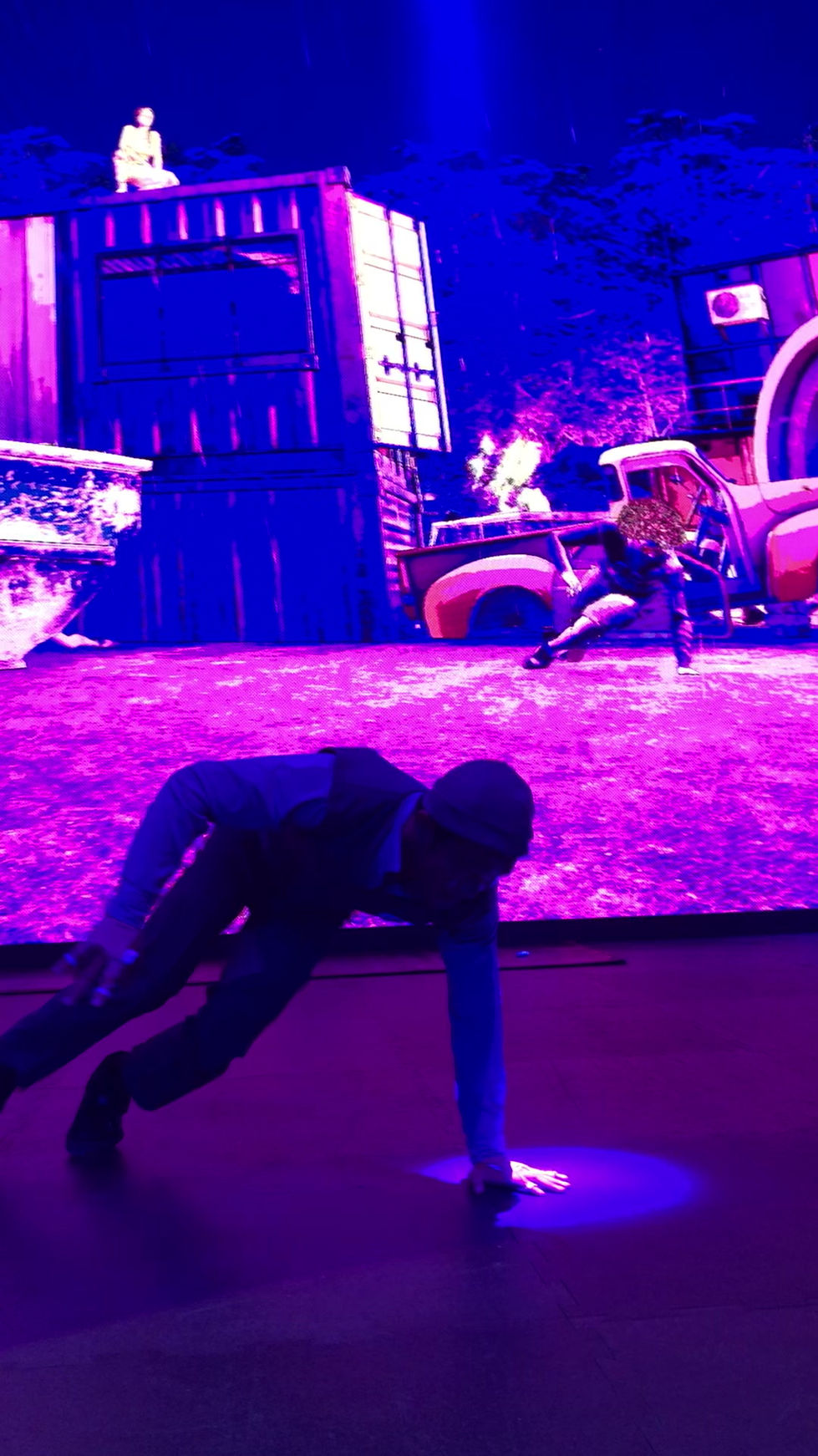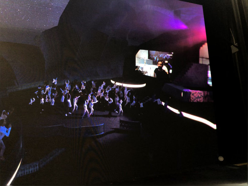 In the early part of the show, I aimed to create compositions which blended the live action and 3d spaces cohesively, coordinating stage lighting with the lighting in the virtual environments in simple, wide compositions which were easily legible.